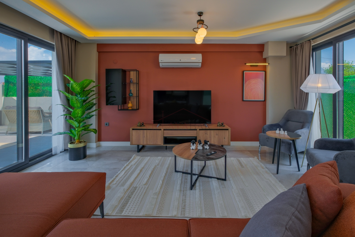 Salon Mutfak: Salon içerisinde modern bir oturma grubu, TV, klima ve havuz terasına direk çıkış bulunmaktadır. Modern Amerikan mutfak içerisinde buzdolabı, çamaşır ve bulaşık makinesi, 3’ lü ocak seti, tost makinesi, çay ve kahve makinesi, mutfak araç gereçleri ve 6 kişilik yemek masası bulunmaktadır.