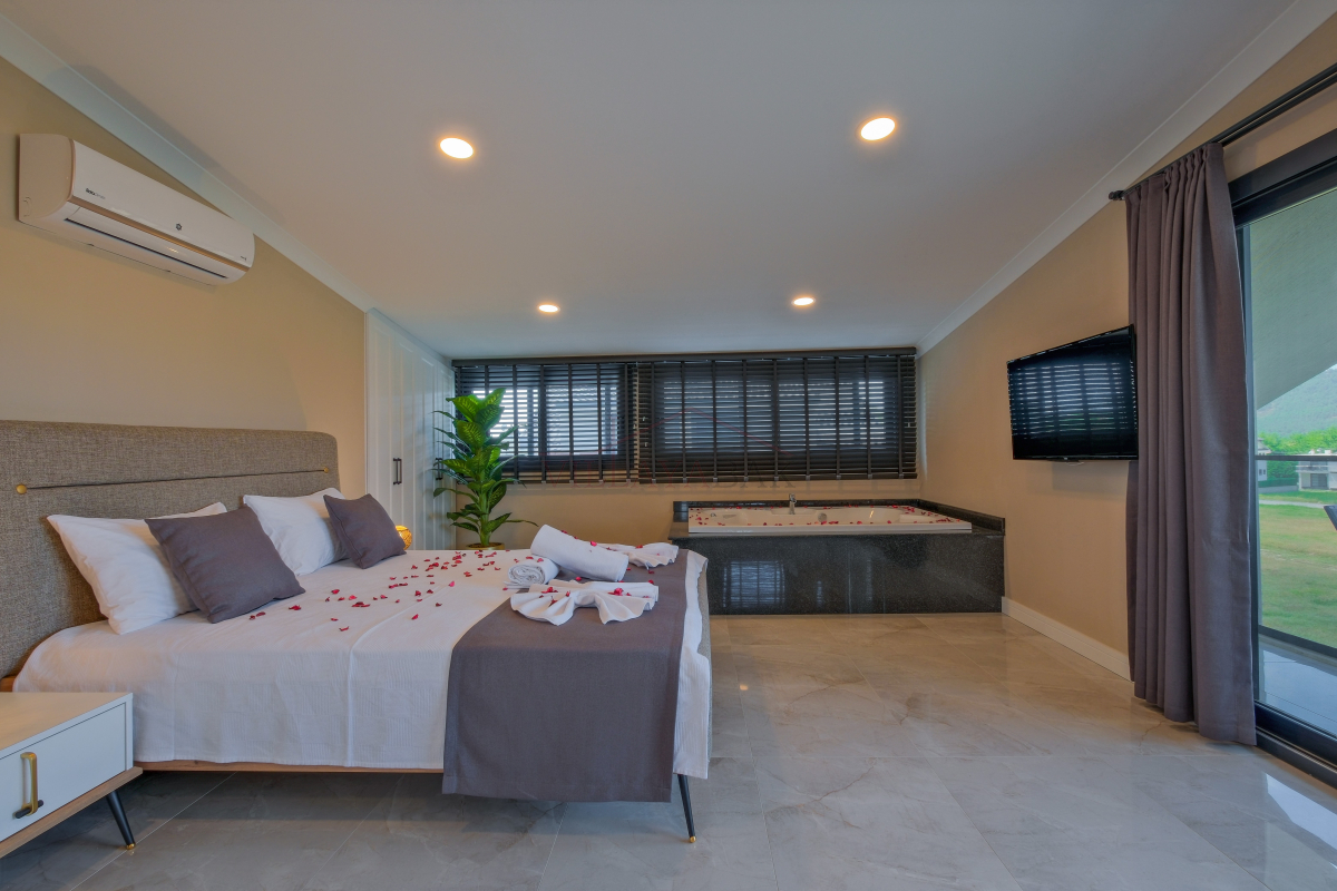 3.Yatak Odası: Oda içerisinde 1 adet çift kişilik yatak, komodin, giyinme bölümü, makyaj masası, klima, televizyon, balkon oturma grubu, jakuzi ve ebeveyn banyosu bulunmaktadır.