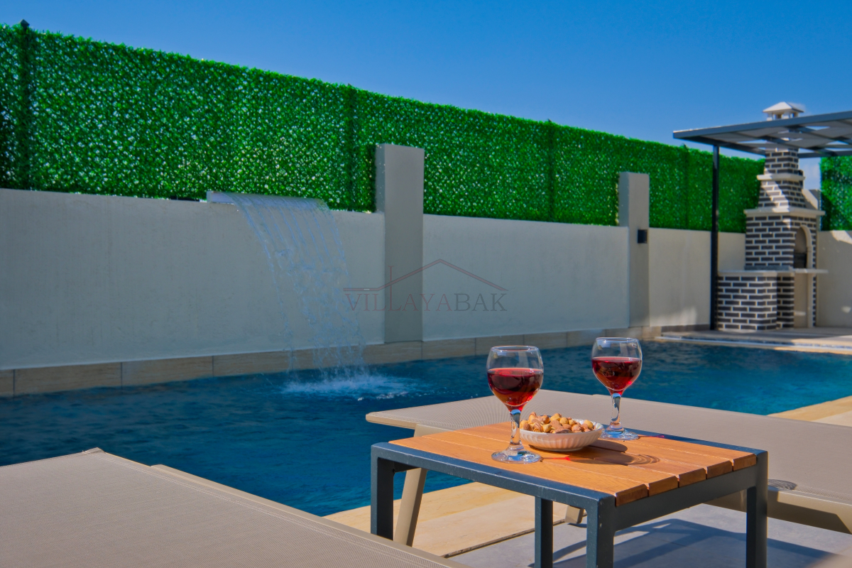 Havuz: Villamıza özel 3x8 metre ebatlarında 150 cm derinliğinde yüzme havuzu ve 3x2 metre ebatlarında sığ havuz bulunmaktadır. Havuz ve bahçe bakımı günde 1 kez sabah veya akşam yapılmaktadır. Havuz kenarında ise şezlong, bahçe oturma grubu, salıncak bulunmaktadır.
